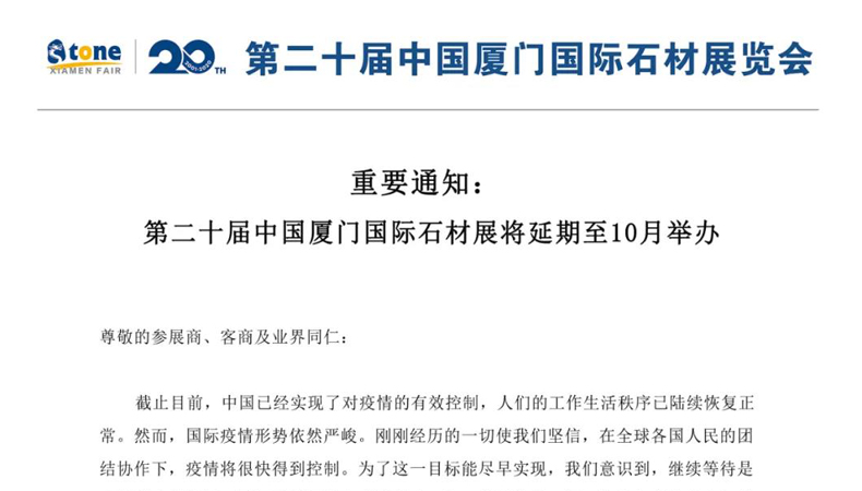 廈門國(guó)際石材展宣布再次延期,延至10月27-30日舉行!